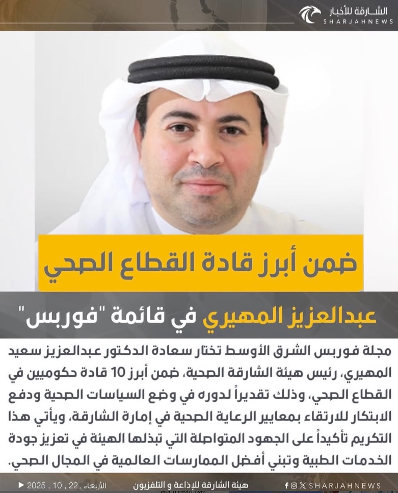 Forbes Middle East selected Dr. Abdulaziz Saeed Al Mheiri, Chairman of Sharjah Health Authority, among the Top 10 Government Healthcare Leaders in recognition of his outstanding leadership in shaping health policies and driving innovation across Sharjah’s healthcare sector.